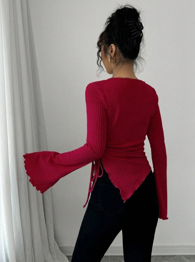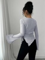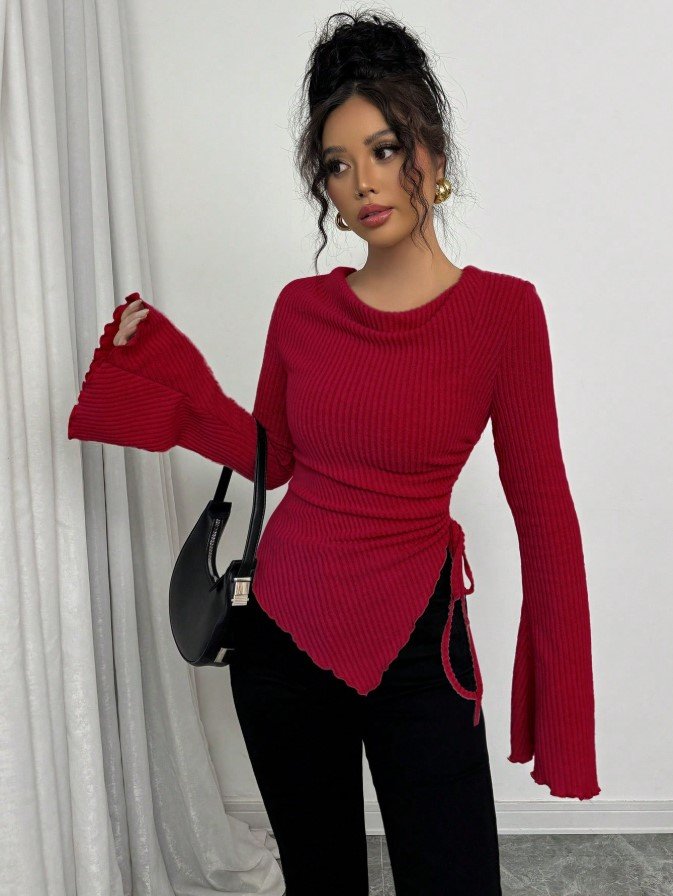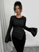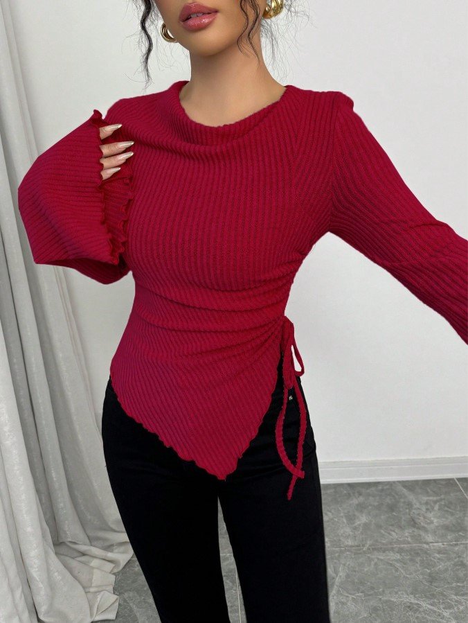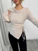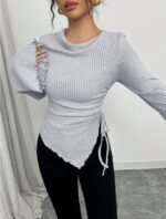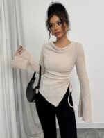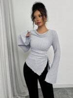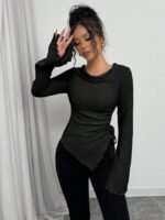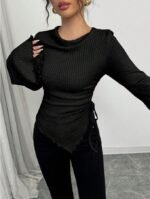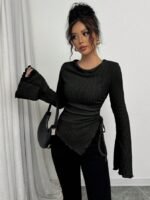 تي شيرت بياقة عالية، ثنائي الأكمام الواسعة وهيم غير متماثل، مع رباط للمرأة ، خريف/شتاء