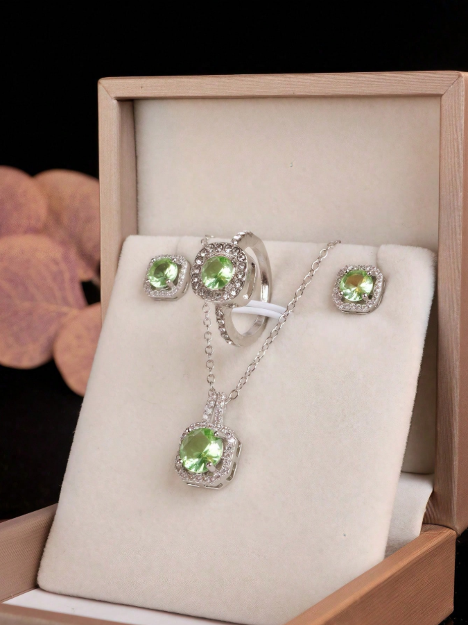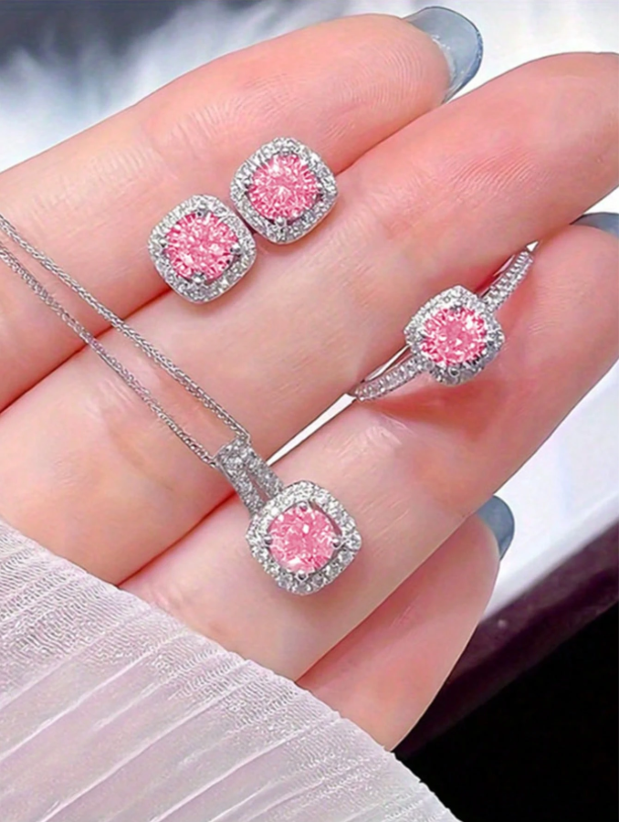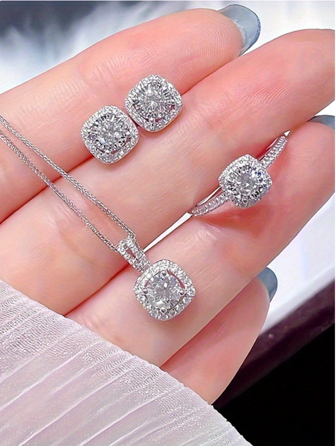 طقم مجوهرات فضي نسائي أنيق يتكون من 4 قطع تشمل أقراط راين مستطيلة وقلادة وخاتم مصمم بدقة ليضيف لمسة من الفخامة والرقة على إطلالتك في جميع المناسبات.