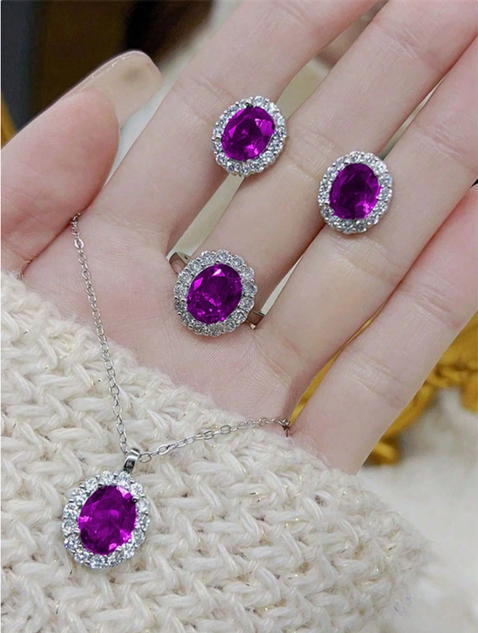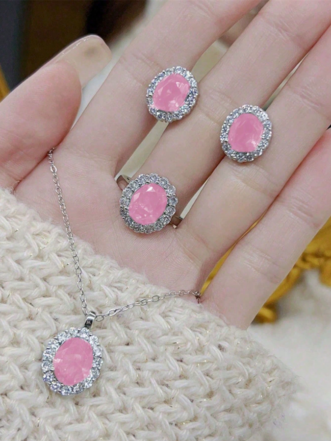 الرئيسية اكسسوارات نسائيه طقم مجوهرات فضي نسائي 4 قطع/ مجموعة من أقراط الراين المستطيلة، طقم قلادة وخاتم، هدية أنيقة فاخرة رقيقة للنساء