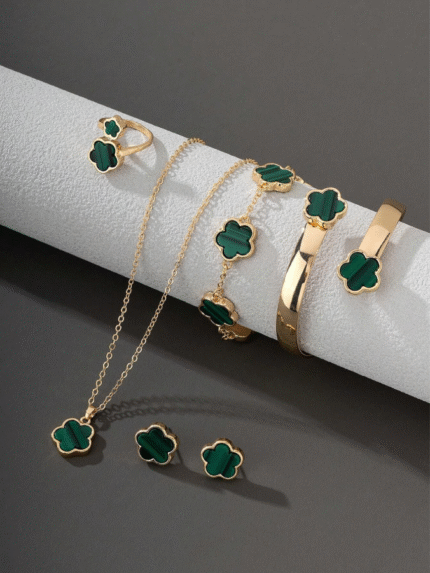 مجموعة مجوهرات للنساء تتضمن: قلادة واحدة مع قلادة شكل اربع أوراق، سوار واحد، أقراط زوج واحد، خاتم واحد، أسوره واحدة