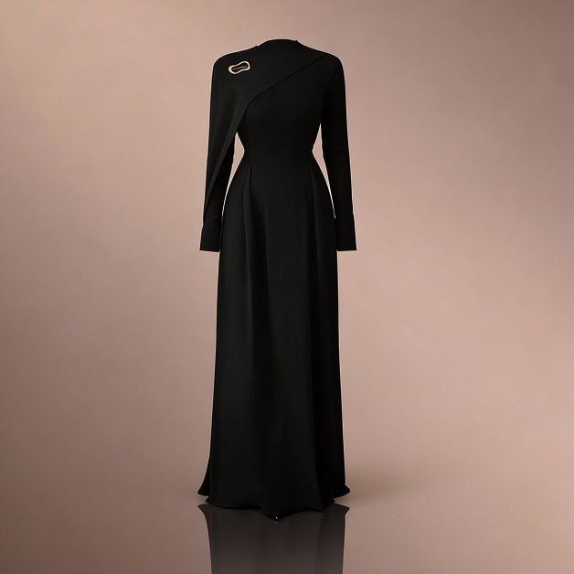 - فستان أنيق بياقة عالية وأكمام طويلة على شكل حرف A بتصميم عصري يمنحك مظهراً فخماً يتناسب مع المناسبات الرسمية والخاصة.