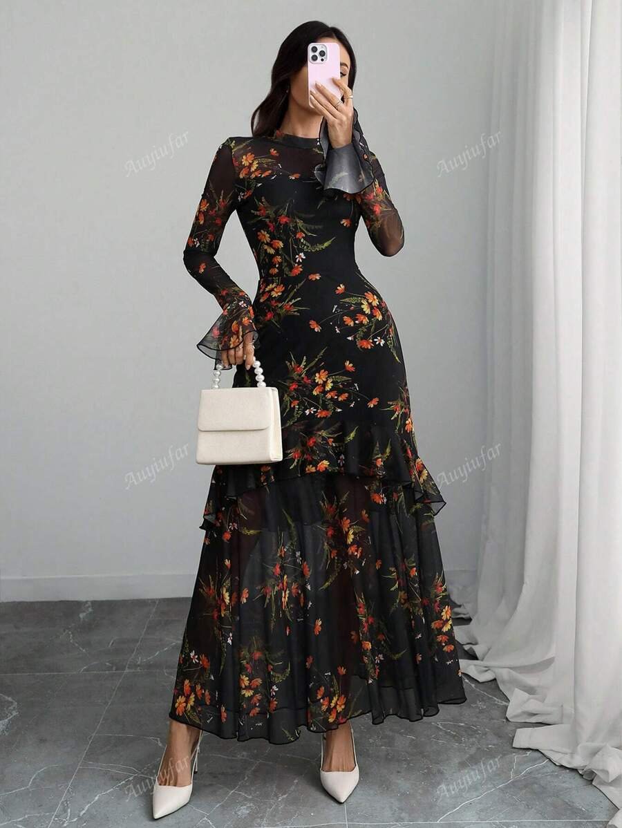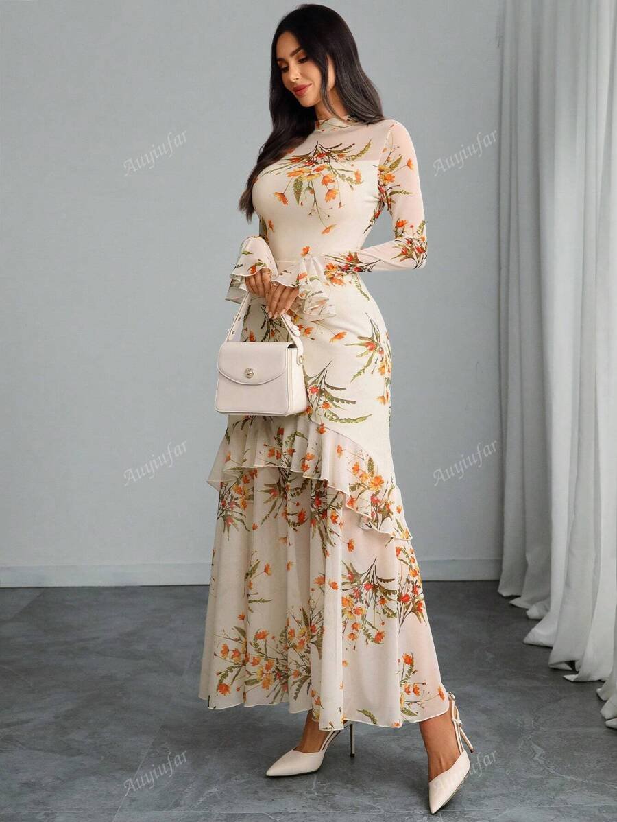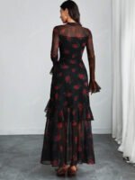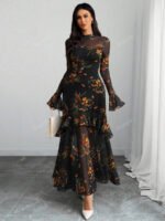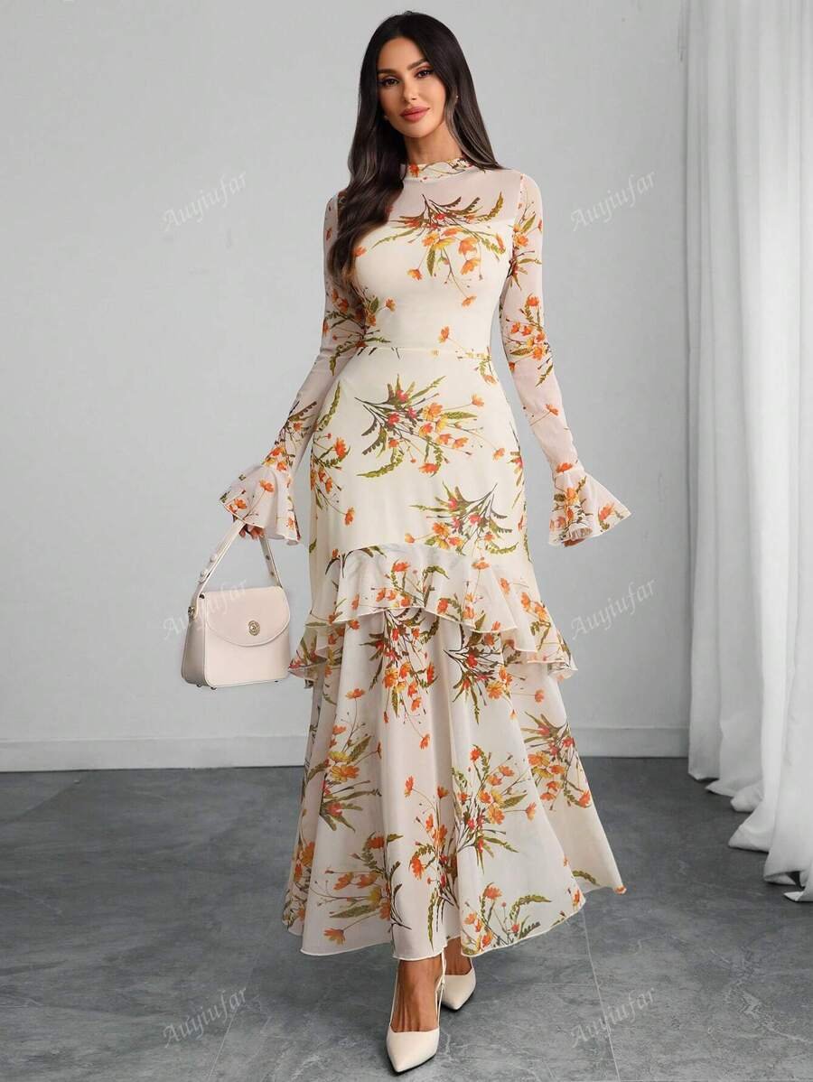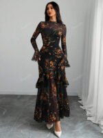 Modelyn اليوم الوطني السعودي فستان أنيق وجذاب للنساء من قماش شبكي مطبوع به طبقات منسدلة مع شق جانبي