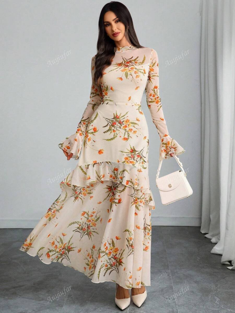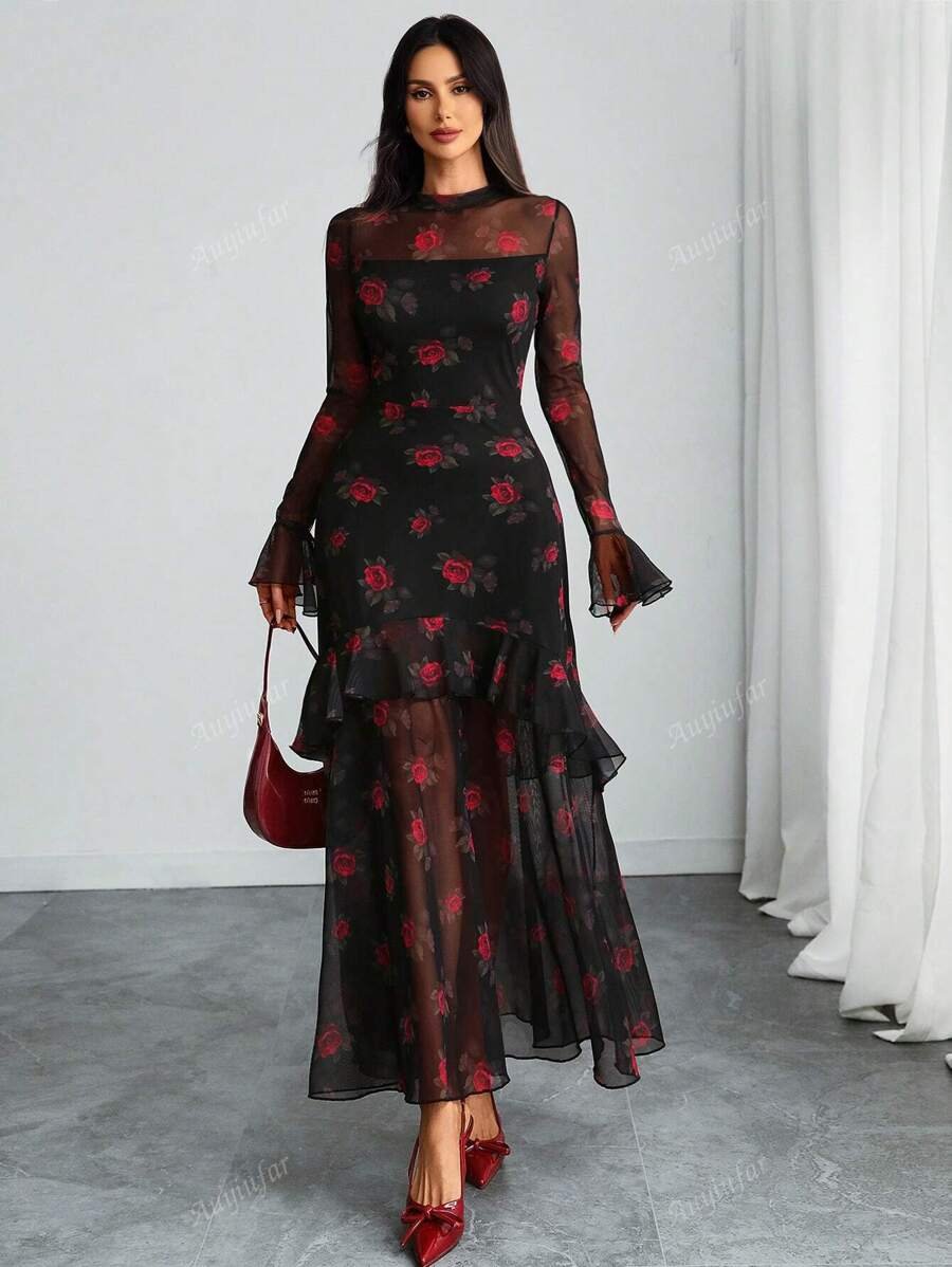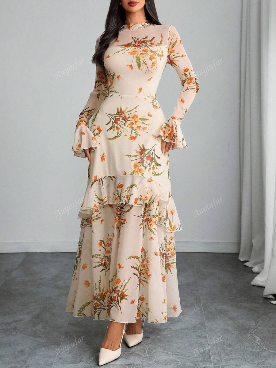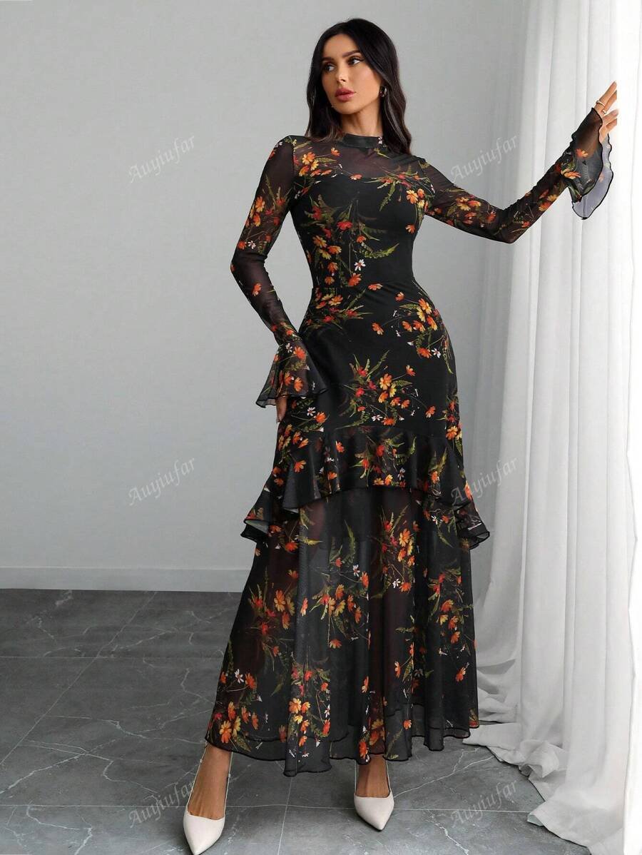 Modelyn اليوم الوطني السعودي فستان أنيق وجذاب للنساء من قماش شبكي مطبوع به طبقات منسدلة مع شق جانبي
