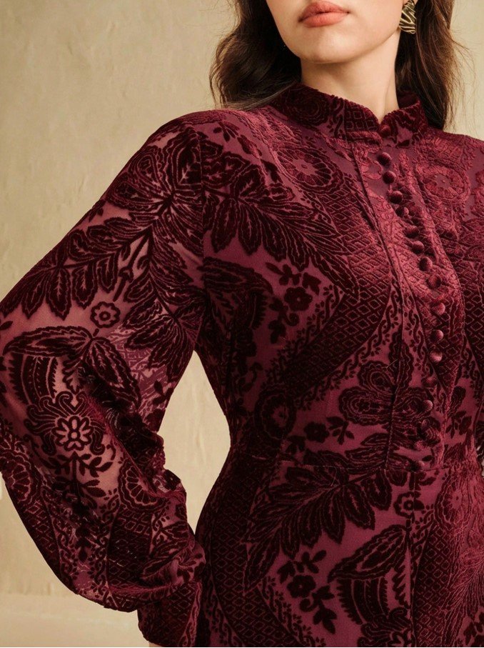 الرئيسية ملابس نسائيه فساتين فستان بياقة عالية وذيل مرن مطبوع بالحرق بلون الأزرق الداكن مقاس كبير الحجم