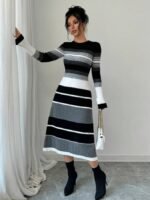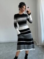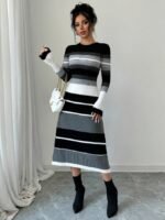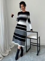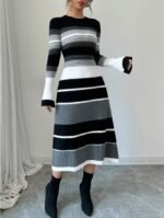 فستان وسط متموج بأكمام مموجة، بألوان متباينة مخططة، بياقة على شكل طاقم للنساء