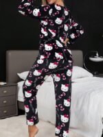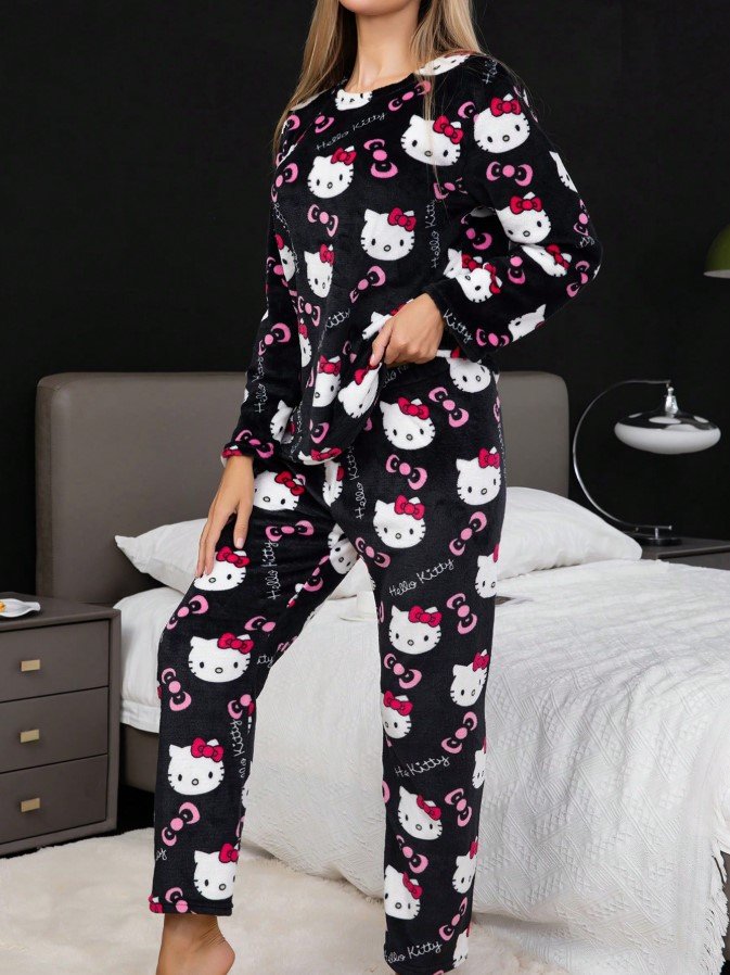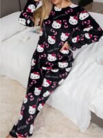 مجموعة بيجامة نسائية من قطعتين مزينة برسوم هالو كيتي الكرتونية الجميلة، من الفلانيل الدافئ السميك والناعم، بتصميم كم طويل وياقة طاقم وبنطلون، بفضفاضة ومريحة، مناسبة للخريف والشتاء