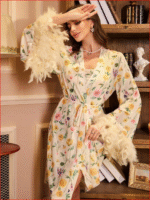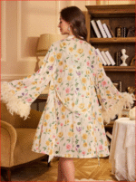 مجموعة قميص نوم وردة بطبعة زهرية وشبكة ريش 2 قطعة