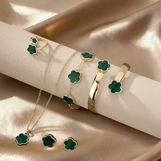 - عدد القطع: 6 قطع متكاملة تشمل قلادة وقلادة بأربع أوراق وسوار وأسورة وأقراط خاتم.