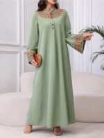 Al Najma رمضان فستان كاجوال أنيق بتطريز دانتيل أخضر زيتوني على الطراز العربي للنساء