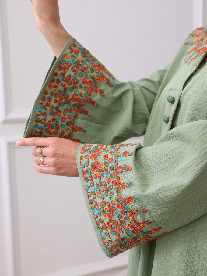 فستان طويل الأكمام بياقة على شكل حرف V مطرز بزهور منفصلة ، كفتان محتشم للسيدات