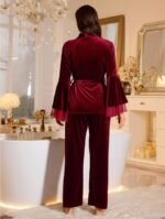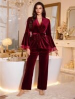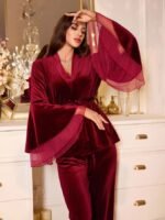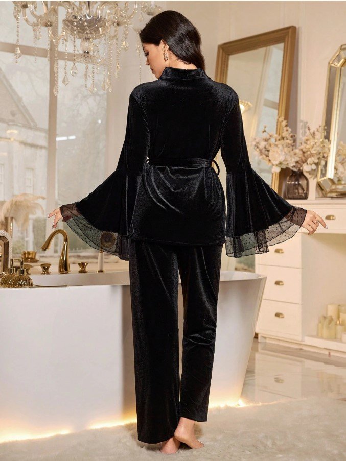 LuxeNights مجموعة بيجاما من قطعتين للنساء، تتكون من ملابس علوية طويلة الأكمام مخملية وبنطال، مع تصميم كم ناقص وقطع شبكي، مناسبة للخريف والشتاء