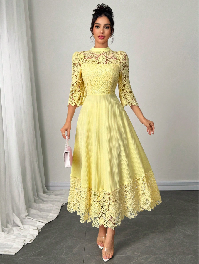 الرئيسية ملابس نسائيه Modelyn اليوم الوطني السعودي فستان ماكسي طويل الأكمام للنساء مزين بالتطريز والخياطة بالعروة الصفراء