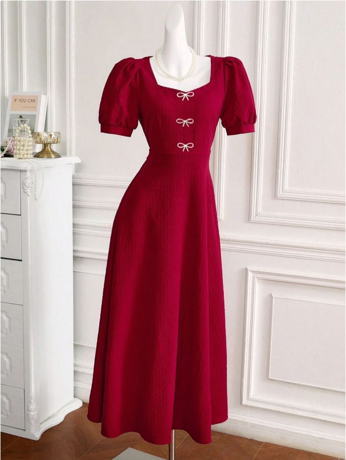 Modelyn اليوم الوطني السعودي فستان أبايا طويل أنيق للسيدات بأكمام فانوس وياقة على شكل حرف V وذيل مطوي، بلون أحمر زهري داكن